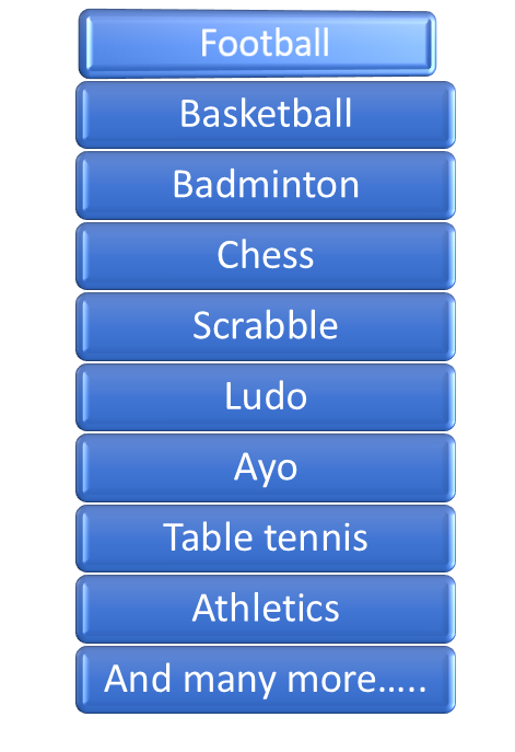 To help stimulate our students’ interest in games and sports, we have diverse kinds of games and sports available for all categories of our learners. They are outlined below: